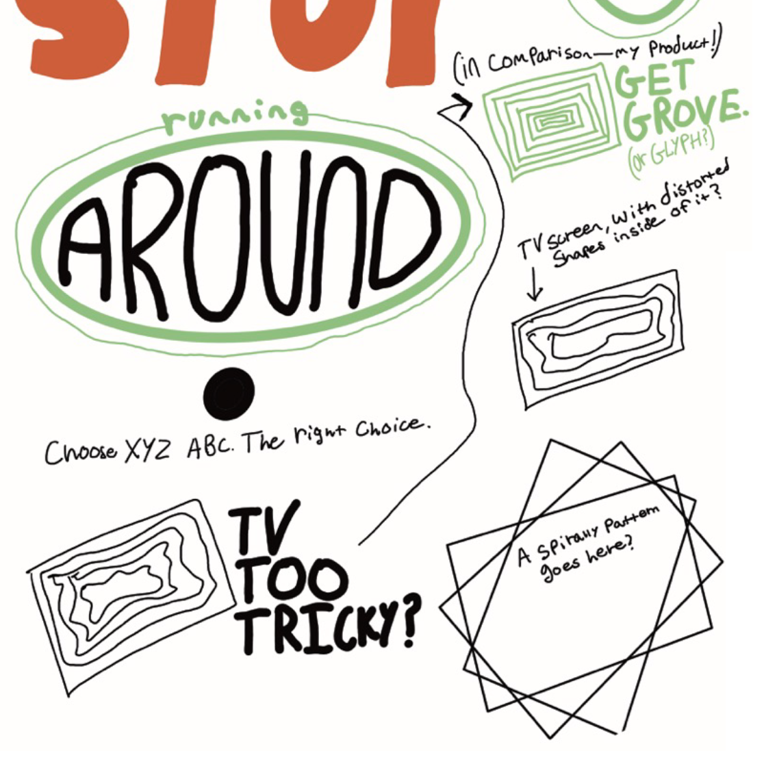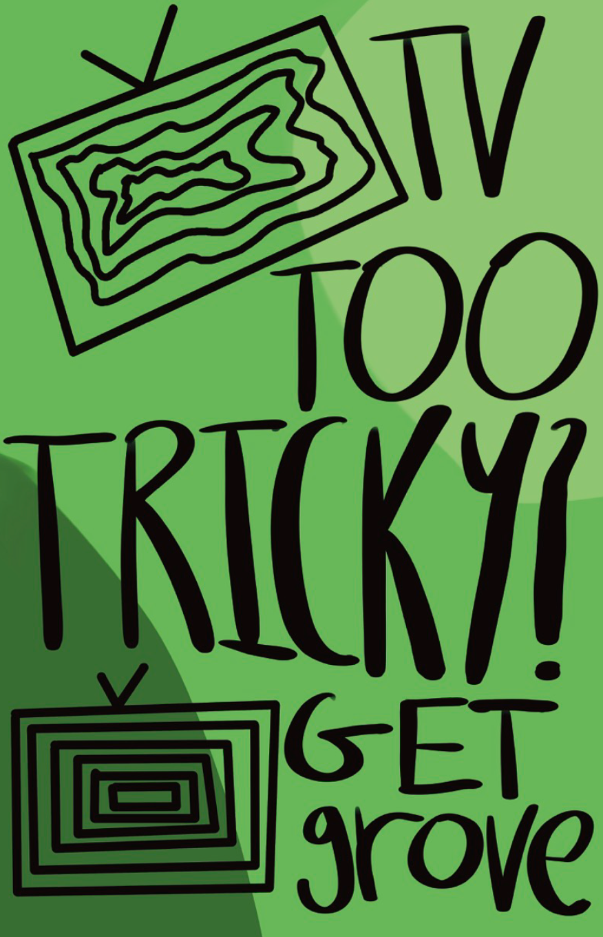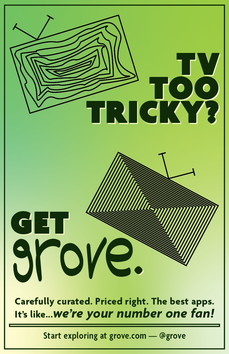 On the left: some brainstorm sketches for the brand and its elements. I settled on the idea of a distorted television set representing today's fractured streaming service landscape with a more organized television set representing grove. The slogan I stuck with was "TV TOO TRICKY? GET grove." On the right: an initial design for the poster advertisement, drawn in Procreate.
