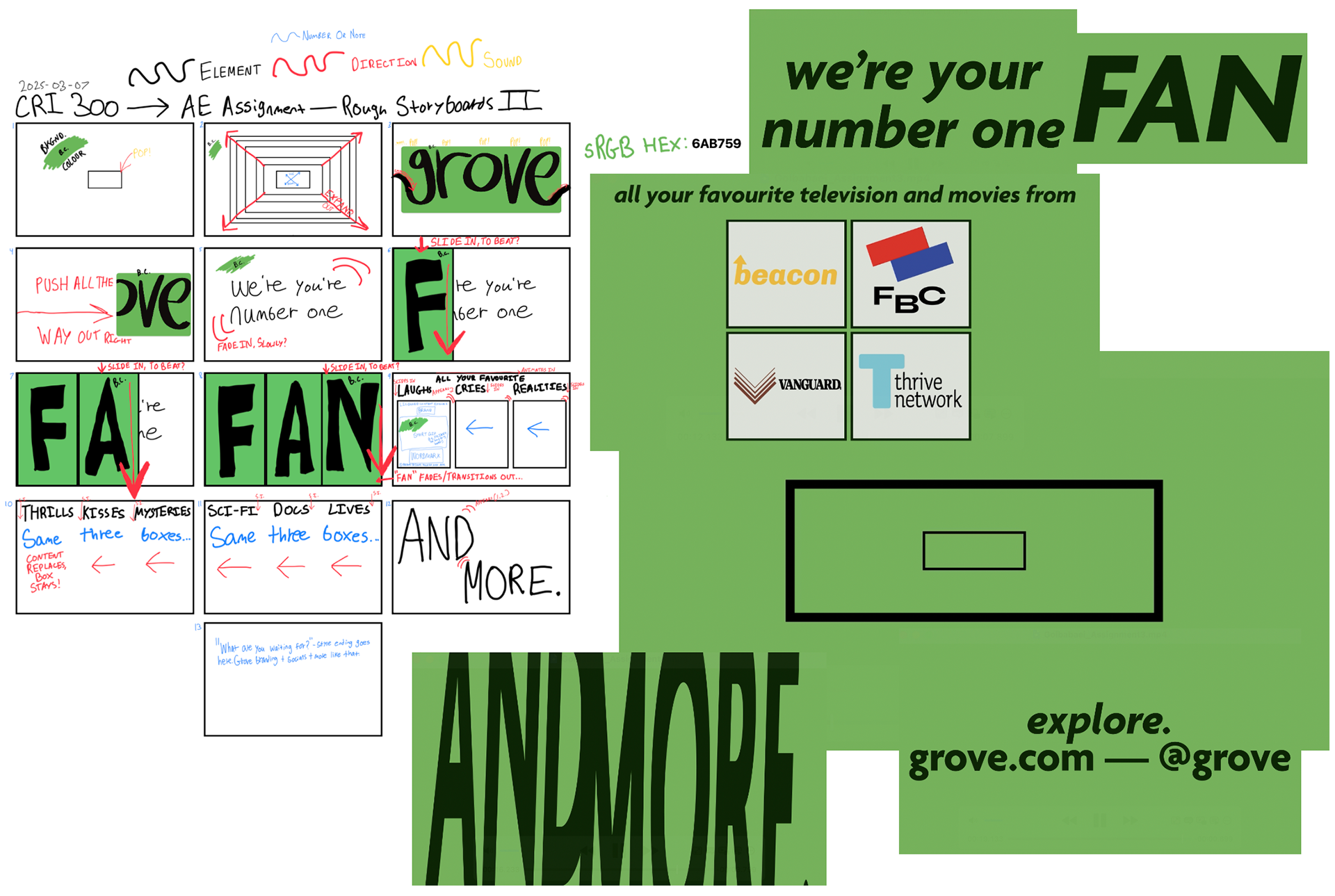 Lastly, on the left: brainstorm storyboards for the video advertisement created in Freeform. I used different colours to indicate between graphic elements, intended motion graphic directions, sounds, and notes for the storyboards. I had a much more dense plan to use actual clips of my favourite television and movies along with their respective brands from the real world (i.e., with a streaming service like Crave here in Canada, their advertisements show the respective brands they've licensed the media from, such as "Max Original" for those specific shows on HBO Max in the US), but the assignment brief did not recommend that idea. Thus, when the time came to create the video advertisement, I came up with 4 additional fictional brands to showcase as the star media providers for grove.