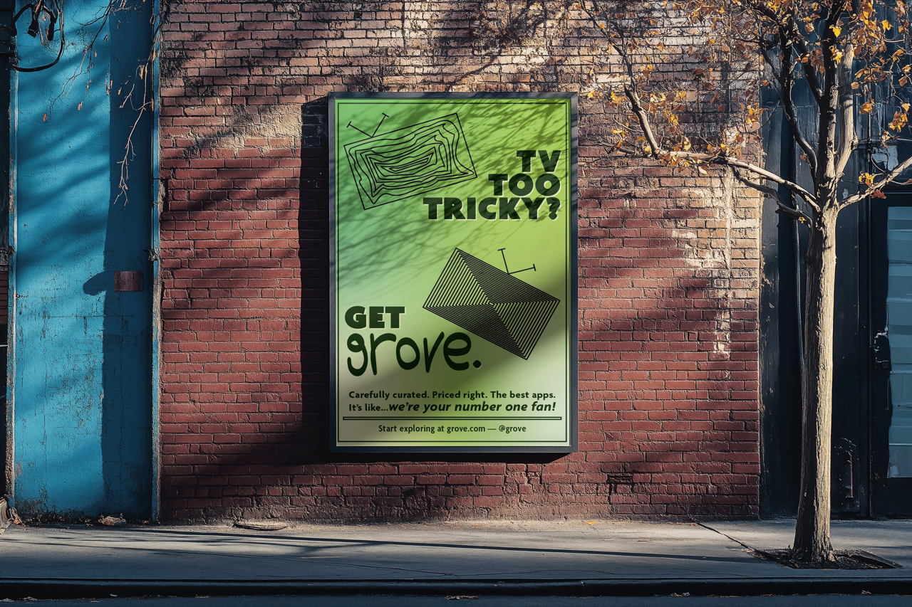 I decided to bring back my interest in TV networks/channels and film/television by advertising a fictional streaming service named grove. My target audience was those who were frustrated with the complexities of finding media to watch due to the compartmentalization of the modern streaming landscape today. The name comes from nature—a grove is a group of trees with little to no undergrowth. Curated. Organized. grove.