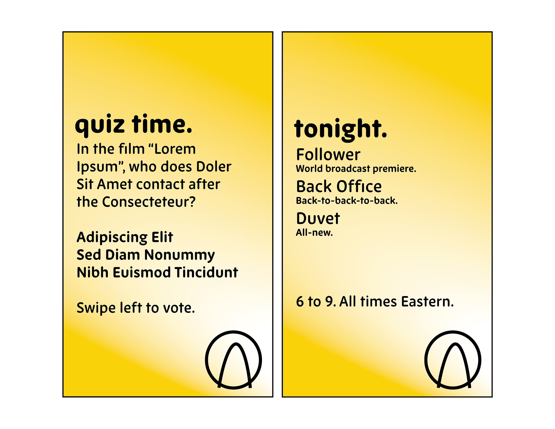 The overarching design language is bright and minimal, based around the colour yellow, with a signature gradient flowing behind most of the pieces created to visualize the network as if it were truly on air.