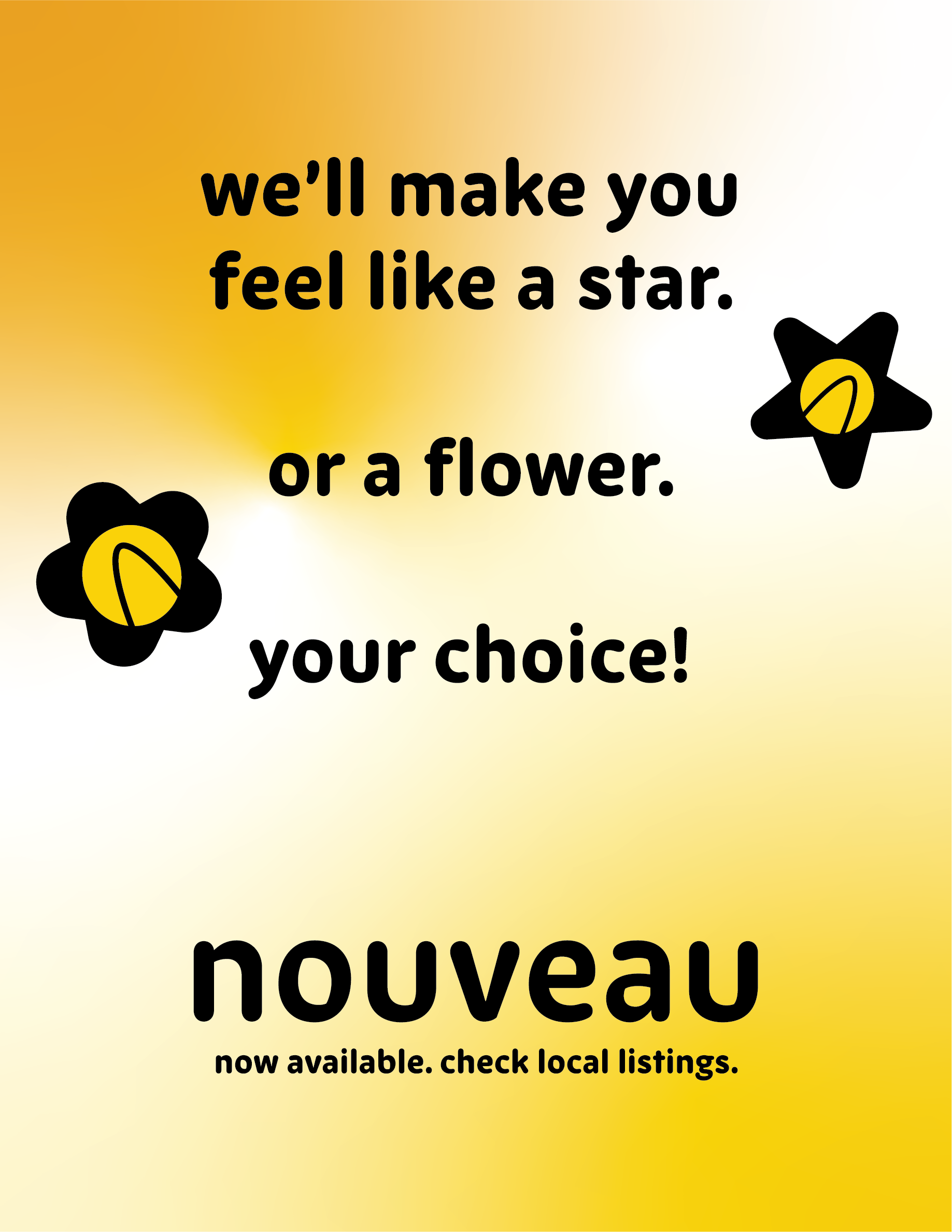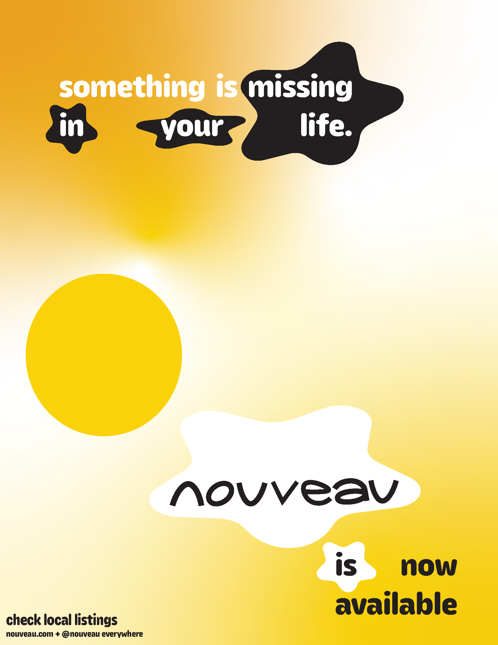 Above: two poster designs intended for use in OOH advertising. The design on the left was created before settling on the final logo. Additionally, in that design, the star shapes encompassing some of the copy create a secondary, subliminal sentence: "nouveau is missing in your life."